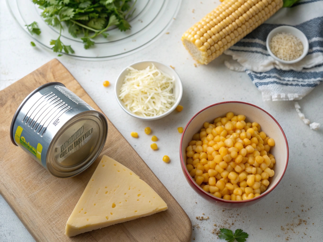 옥수수캔 하나(340g), 튀김가루 2.5스푼 정도, 모짜렐라 치즈 한 움큼, 체다치즈 한 장. 여기에 마무리로 뿌릴 꿀이나 연유만 있으면 끝이다. 튀김가루 없으면 부침가루나 밀가루에 소금 약간 넣어도 된다고 한다.