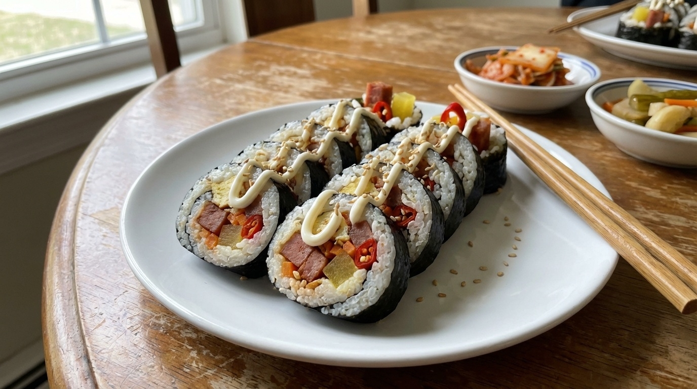 김밥김에 앞서 만든 햄밥을 얇게 펴서 돌돌 말아 먹기 좋게 자르면 완성이다. 마요네즈와 통깨를 뿌려 먹으면 더 맛있다. 일반적인 김밥처럼 여러 재료를 준비할 필요 없이 햄과 청양고추만으로도 중독적인 맛을 만들어낸다.